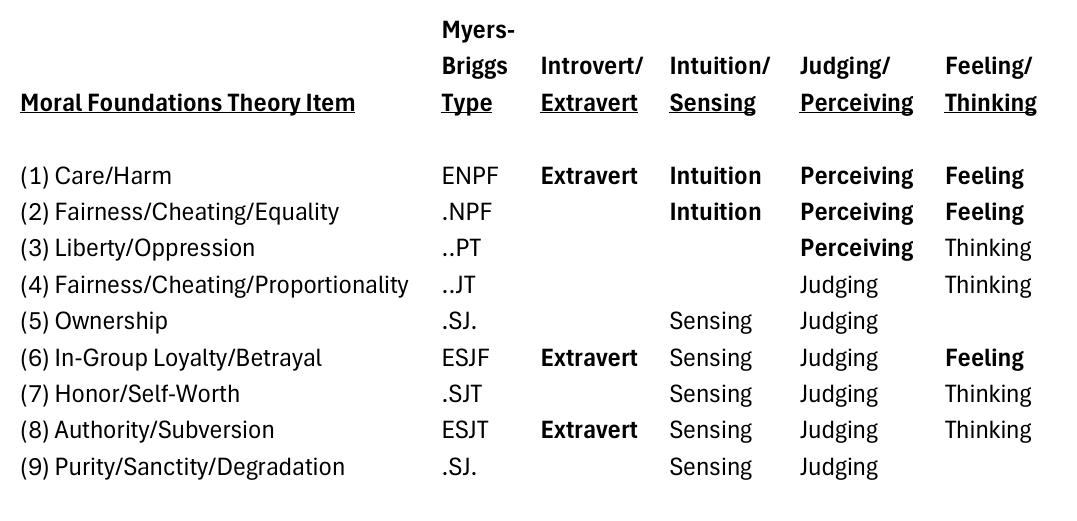 High “feeling” individuals tend to adopt the care and equality moral possibilities. They also tend to support the more conservative value of group loyalty. High “thinking” individuals like the structure provided by proportionality, authority and honor. They also tend to be more sensitive to liberty/oppression.