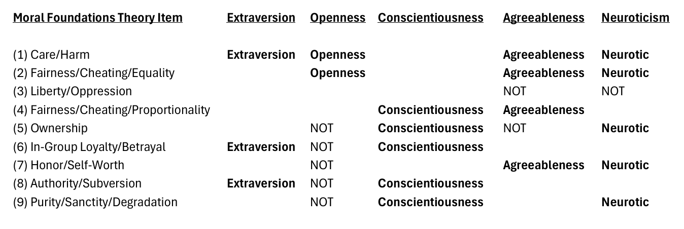 Jonathan Haidt and his colleagues have developed a set of 9 intuitive moral values that are consistent with evolutionary psychology insights. Amateur psychologists appreciate the Myers-Briggs model while professionals promote the “Big 5” personality traits. Google AI allows us to relatively quickly check our intuitive sense of how the moral values connect with the personality traits.