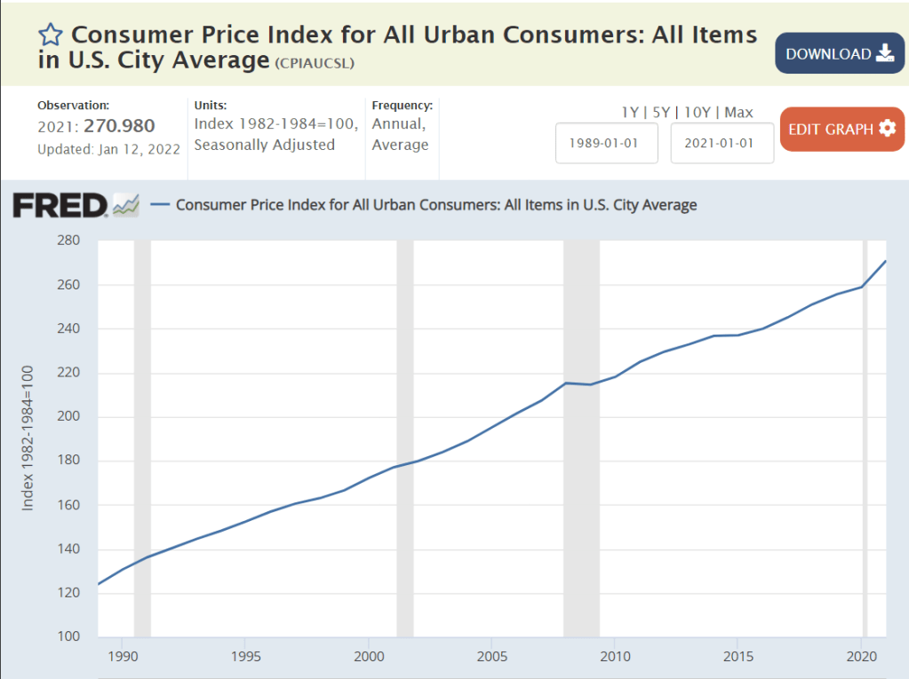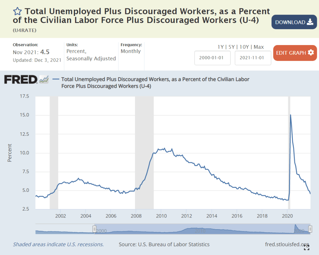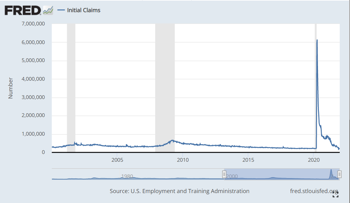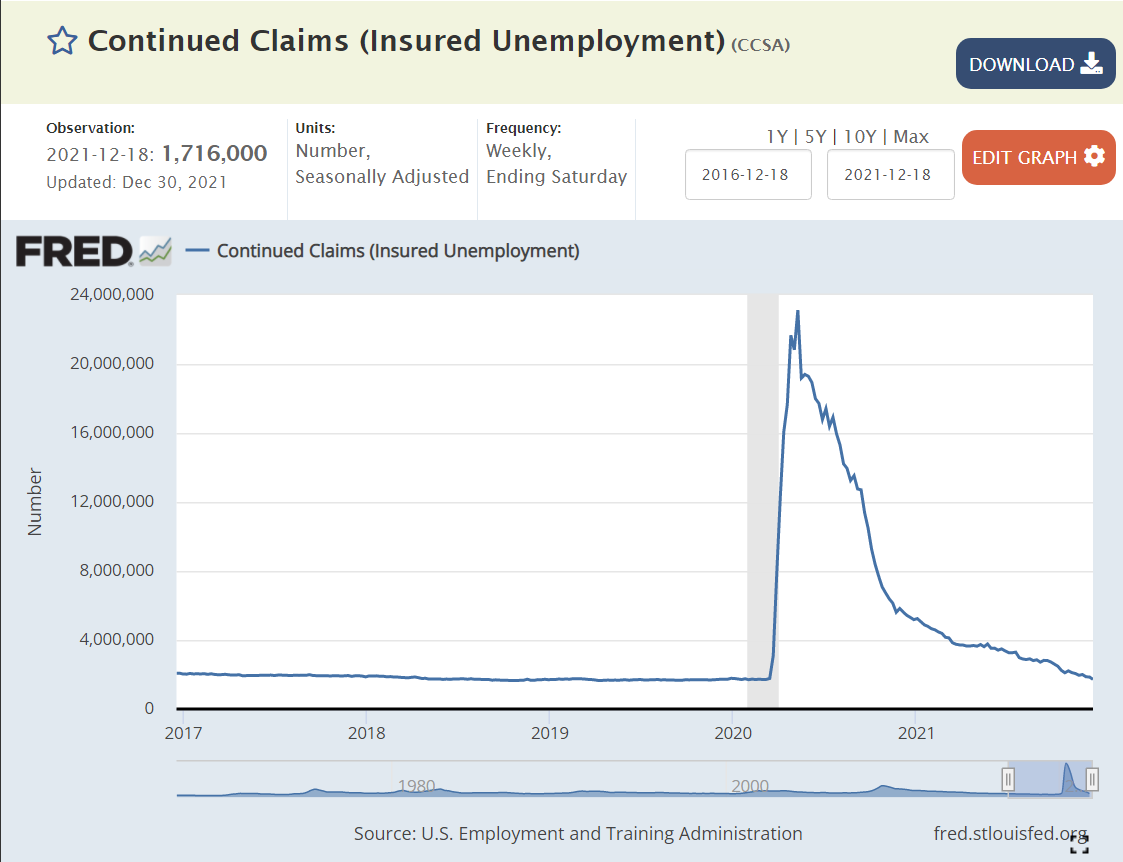 Cumulative individuals claiming unemployment benefits has historically varied with the business cycle. We can see the increase from 2M to 4M at the turn of the century. The “Great Recession” had a greater negative impact, driving this number from 2M – 4M – 7M. This number fell throughout the extended business cycle recovery period, breaching 2M in Feb, 2017 and reaching a low of 1.7M in Feb, 2020. The unemployed number reached a full order of magnitude higher at 23M during the pandemic, then dropping to 13M in Sep, 2020 and 4M in Mar, 2021 and 2M in Nov, 2021 and finally equaling the record low in December, 2021 at 1.7M. This is great news!