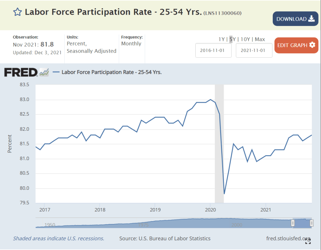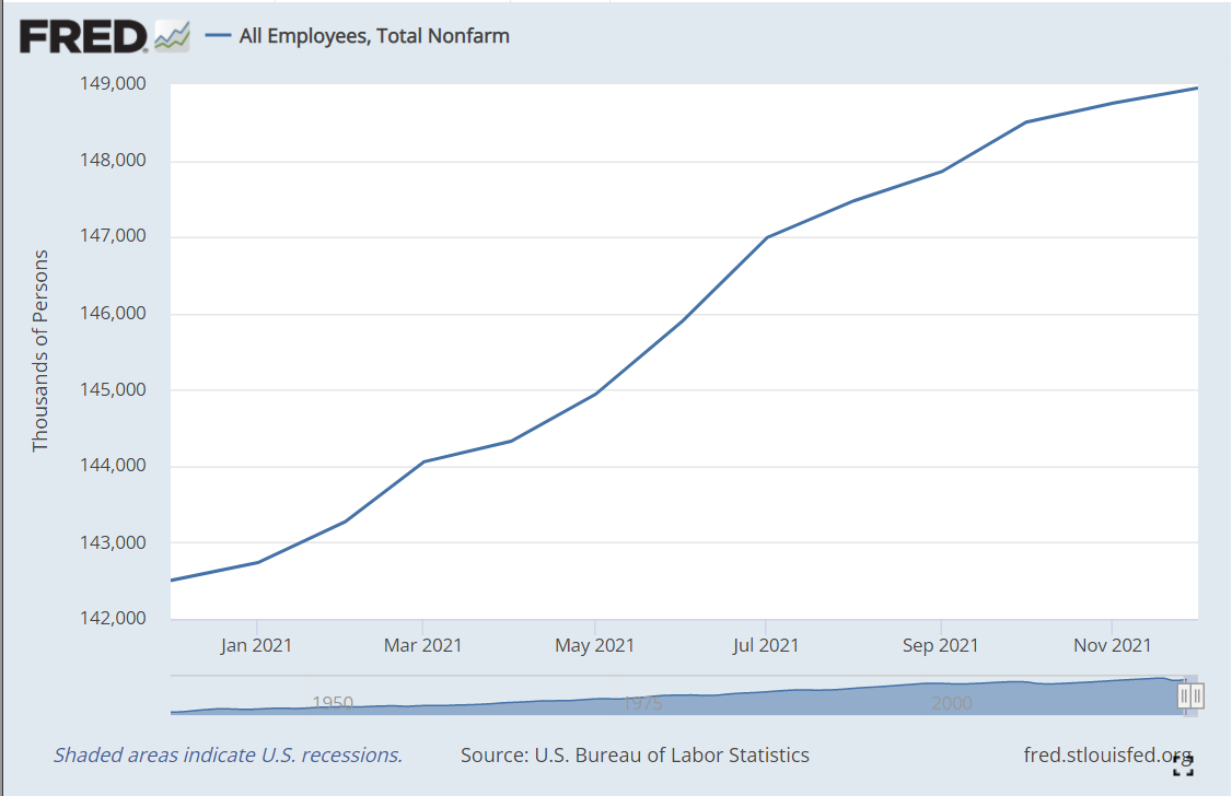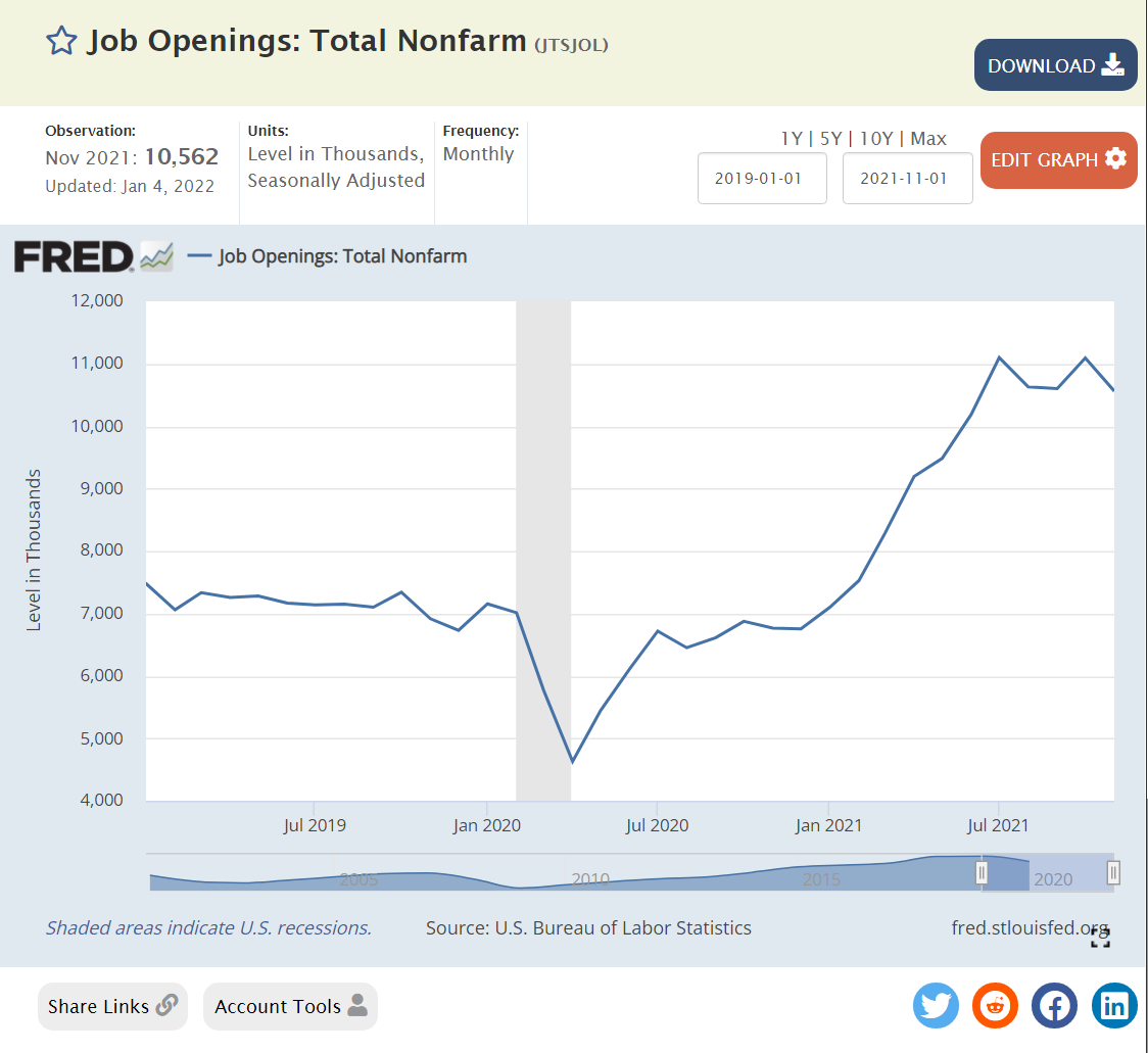 Today’s news releases show 6.0M jobs added during 2021 according to the household survey and 6.5M jobs added according to the employer survey. The ADP employer jobs survey released this week showed 6.2M jobs added. The employer reported number of open jobs increased from 6.8M to 10.6M this year. Hence the total filled plus open jobs increased by 10.6M, from 149.3M to 159.6M, a truly incredible expansion of the US economy’s production potential and demand for labor. This is 1M more filled plus open jobs than the December, 2019 peak of 158.6M. Employers are clearly struggling to work this backlog down from the 10-11M range back to the pre-pandemic 6-7M level. This provides the demand side for another 8-12 months’ worth of 500K filled jobs added per month.