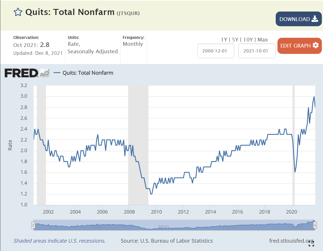 The voluntary “quit” rate has doubled since the good side of the “Great Recession”. It is 50% higher than during the very favorable labor market of 2018-2020. Employees are confident that they can leave their current employer and find another position quickly.