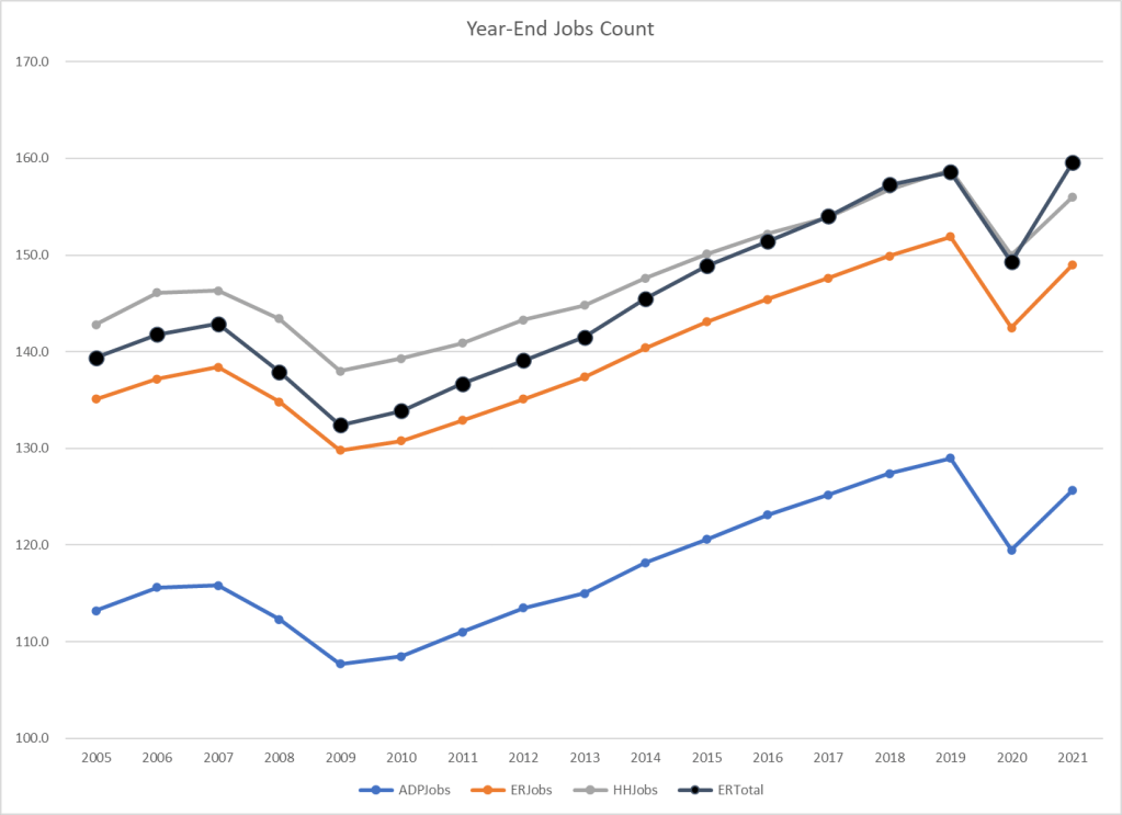 The monthly changes are much less consistent. Much of the media highlighted that the employer survey data showed just 200K jobs added in December. The household survey indicated 600K jobs added, while ADP reported 900K jobs.