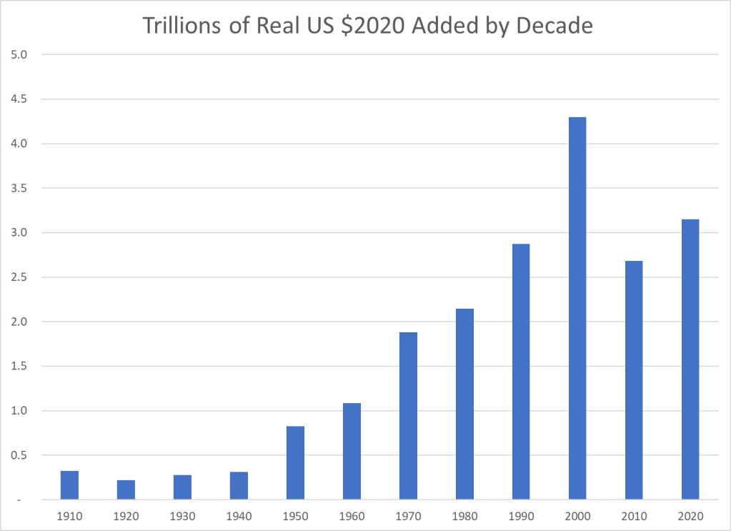 From 1960 through 2020, the economy has added an average of $7,000 more output per American for each decade.