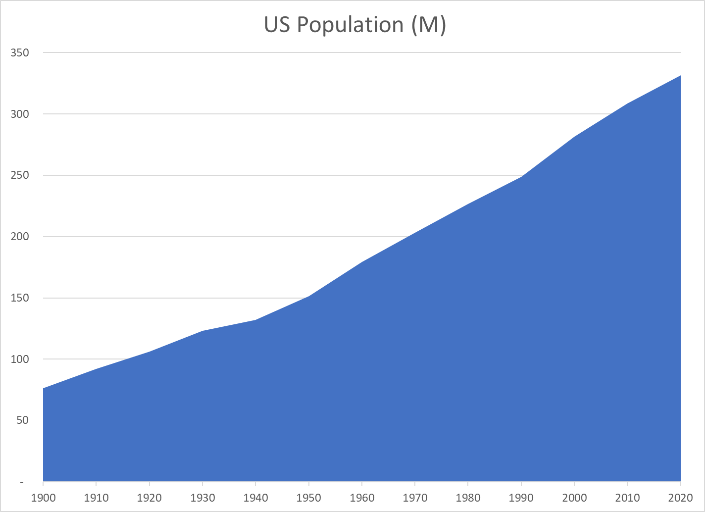 The US population has increased by 4.3 times since 1900, from 76 to 331 million people.