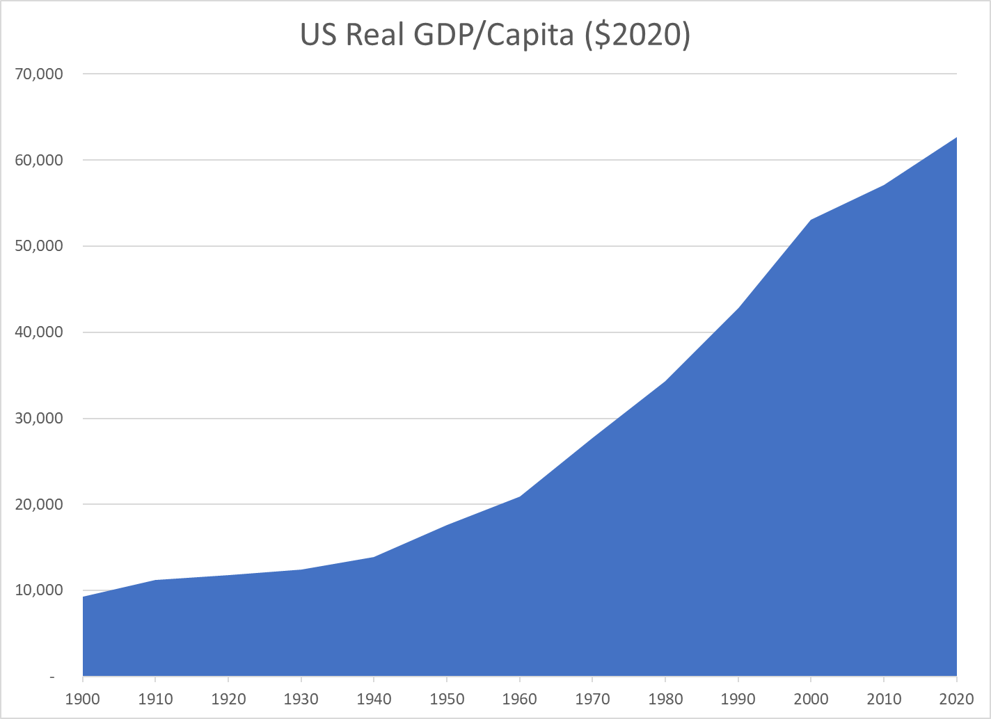 Real (inflation adjusted) Gross Domestic Product (GDP), the value of all goods and services produced in the US reached $20.8 trillion in 2020, compared with only $0.7 trillion in 1900. This is a nearly 30-fold growth across 120 years.