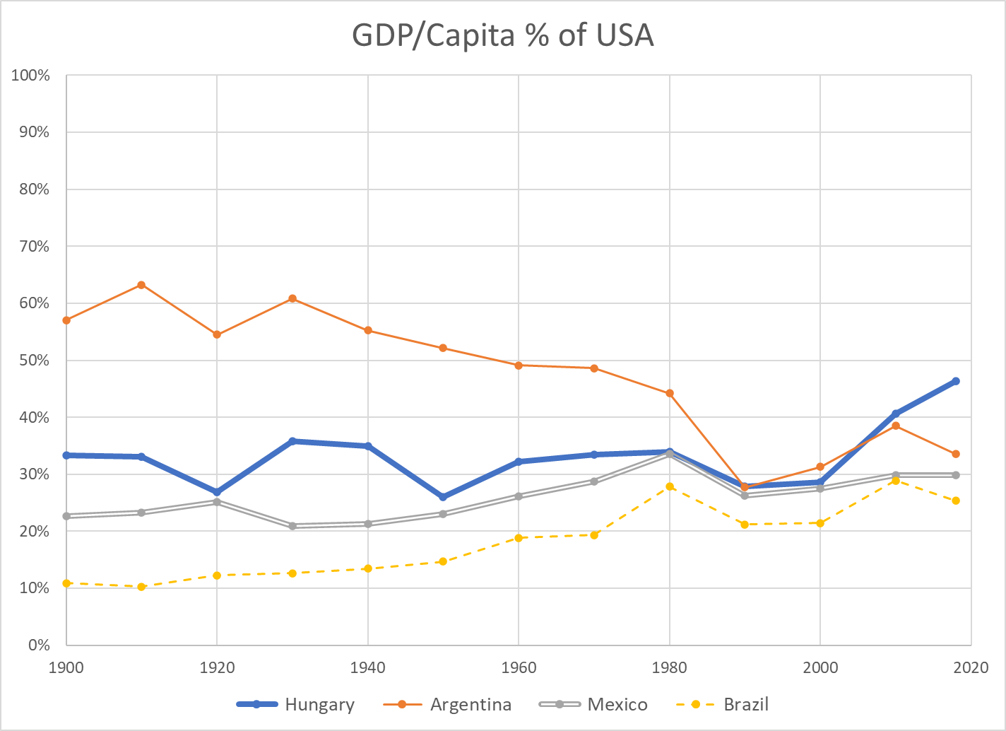 Argentina is an outlier, dropping from 60% to just 35% of US income per person for various political, financial, economic and trade reasons. Hungary is representative of smaller eastern European nations that remained at just 35% of US levels until the fall of the Berlin wall and subsequent integration into the European economy, allowing them to grow towards 50% of the US level. Mexico has slowly grown from 20% to 30% of the US level, but not been able to accelerate further. Brazil has grown from just 10% to nearly 30% of the US level, with significant volatility.