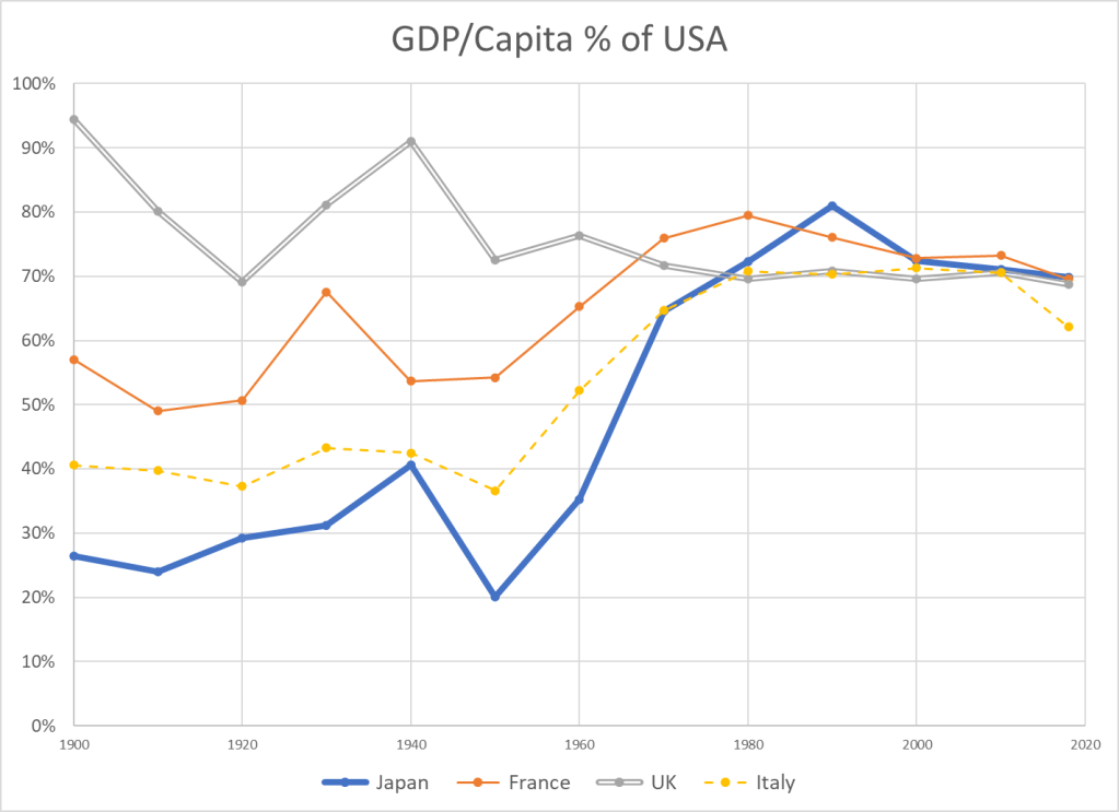 The UK fell from 90% to 70% of the US value added per citizen level by 1970, where it has remained. France weathered the 2 world wars at 55% of the US income level. It recovered nicely to 75% by 1970, peaked near 80% and then drifted back to 70% with its 4-day work weeks. Italy remained at just 40% of the US level through the war years. It grew remarkably to 70% of the US level by 1970, where it remained, before falling back somewhat in the last decade. Japan also struggled through the war years, averaging 30% of the US level. It rocketed to 80% of the US level by 1990, riding total quality management, manufacturing, peacetime and expanded trade. It has dropped back to 70% of the US level.