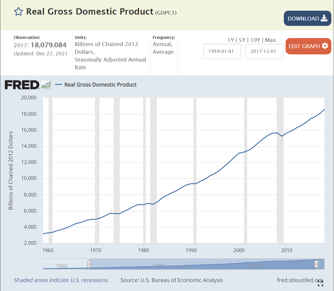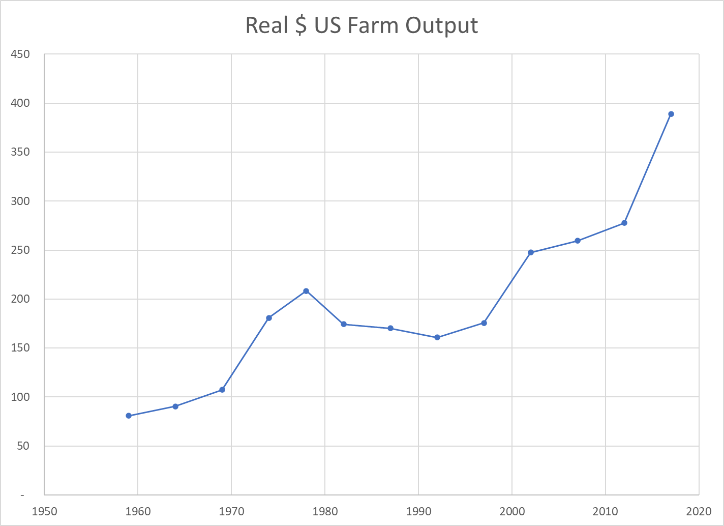 I’ve chosen to examine the near 60-year period from 1959-2017 covered by the censuses of agriculture. During this time, Real (inflation adjusted) US Gross Domestic Product (GDP), the value of all goods and services produced, increased from $3 to $18 trillion dollars, a near 6-fold increase, or 3% annually, year after year after year.
