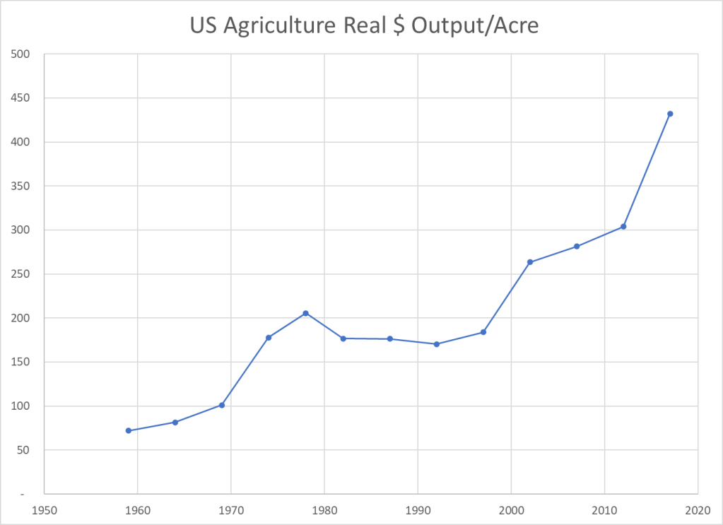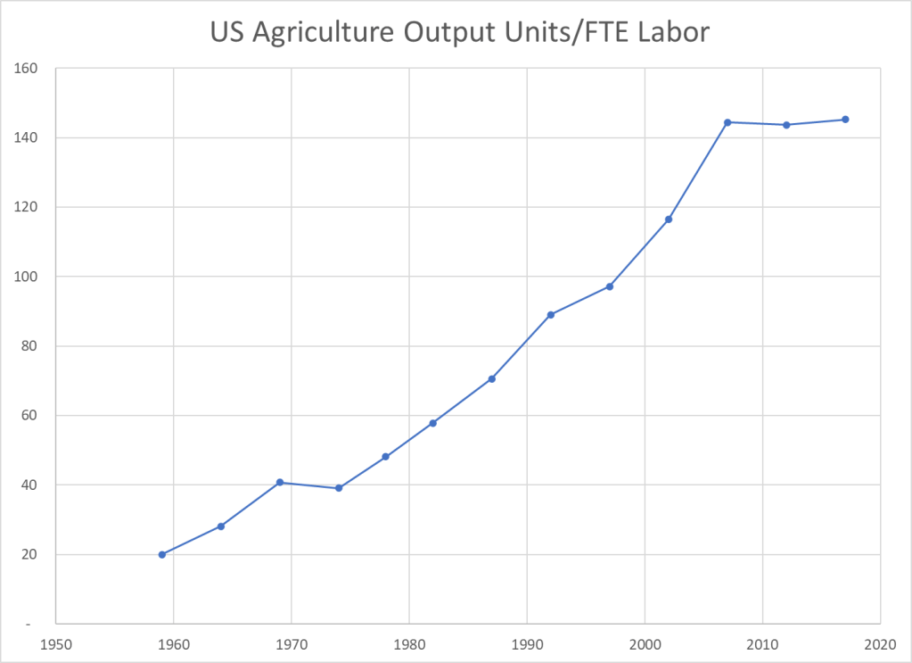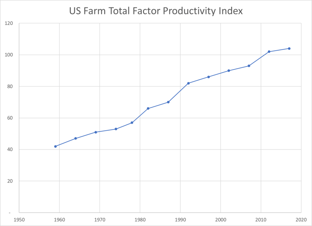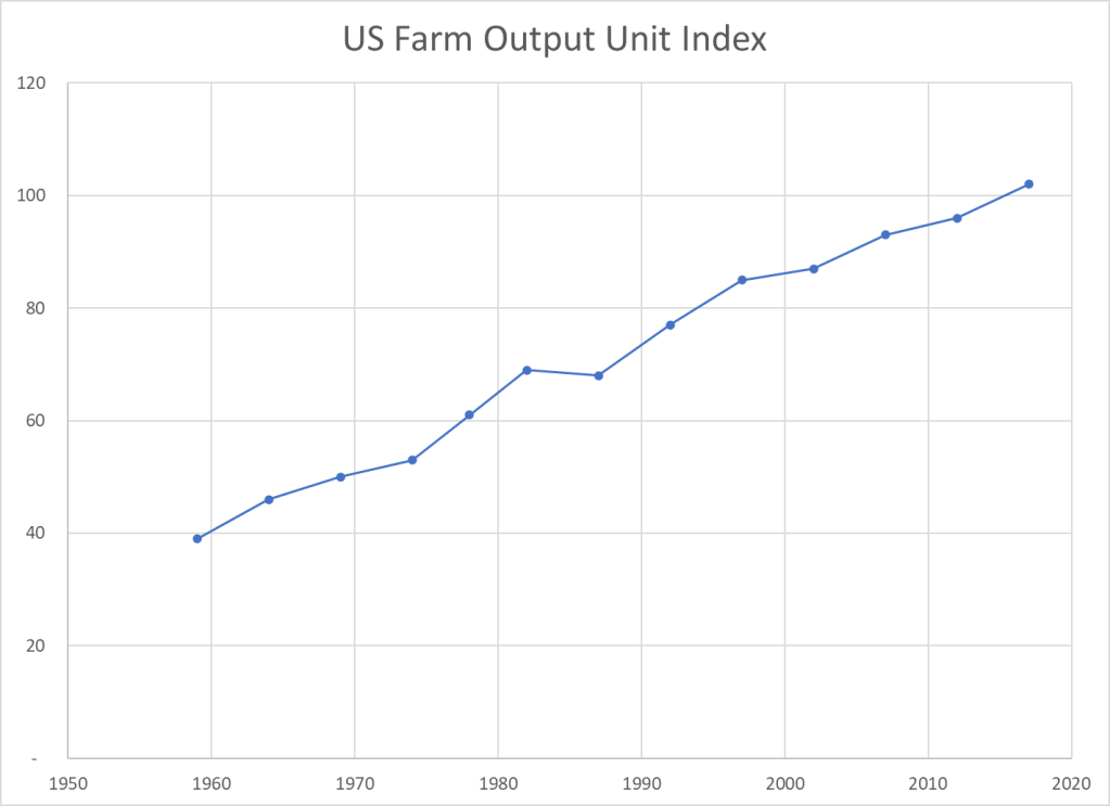 Economists try to measure land, labor and capital as inputs to the agricultural production process. As noted above, land and labor have declined. Capital – equipment, improvements, patents, inventory, etc. has increased. Overall, the total inputs have remained roughly flat for 60 years. Hence, almost ALL of the increased unit output is due to increases in productivity. Better crops, better labor skills, better processes, better methods, better irrigation, better crop rotation and selection, etc. Economists call this “total factor productivity”. After accounting for measurable increased inputs, the remaining improvement is called “productivity”.