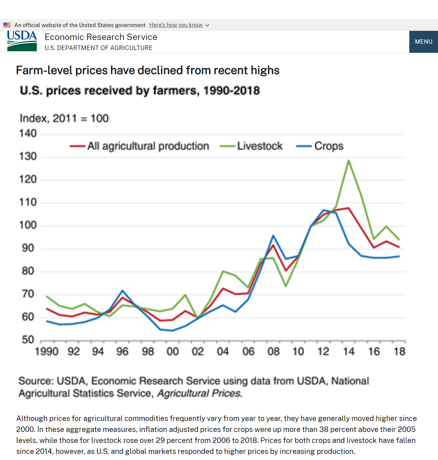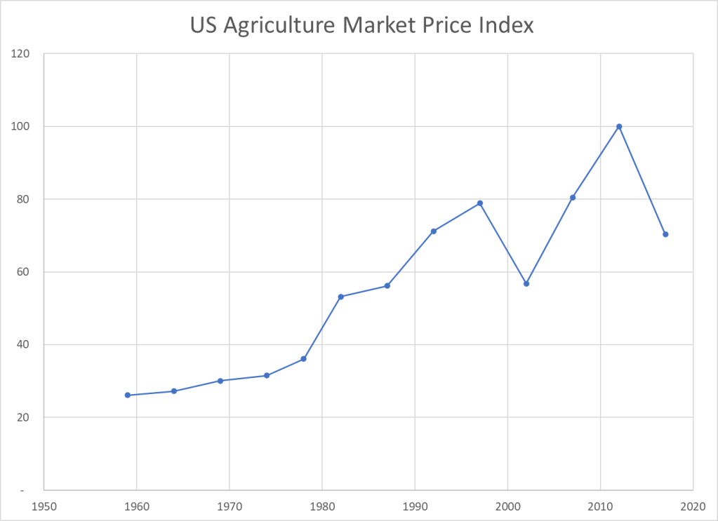 The index of agricultural industry output prices has increased by 3-4x versus 8x for the consumer price index or GDP price index.