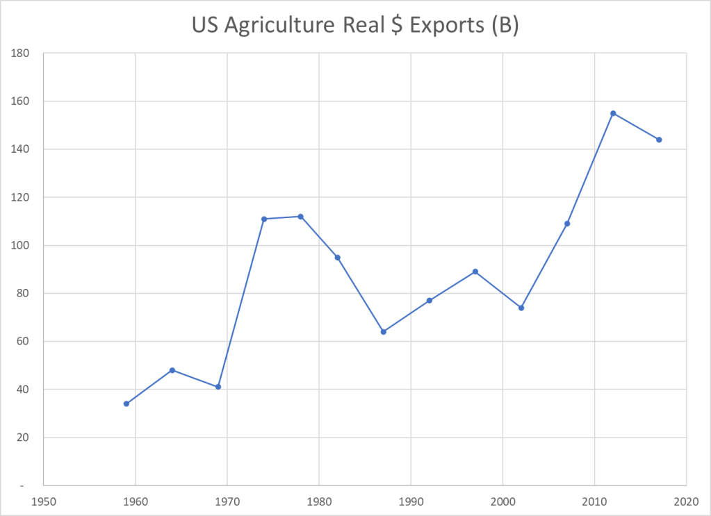 Real ag exports increased 4-fold in these 6 decades, doubling in the first and second 30-year periods.