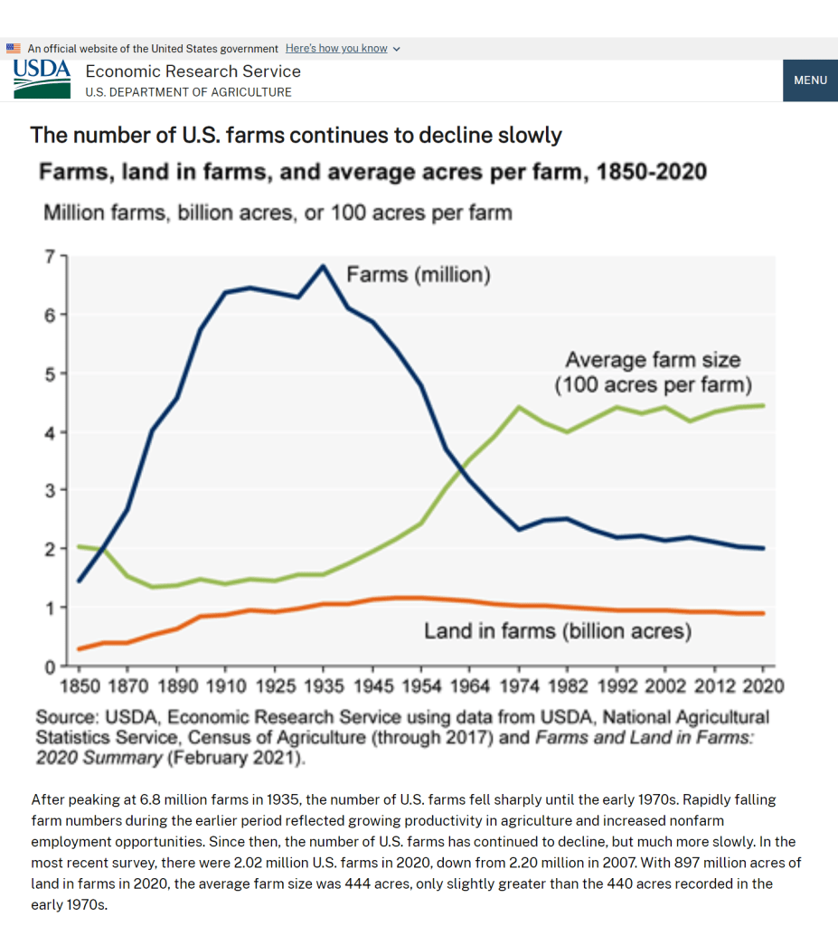 We don’t have an economic series that tracks wage and salary income back before 1979, but real disposable income per capita exists for this whole time period. This indicator or labor costs increased 3.4 times, from $12,600 to $42,900, or 2.1% annually. Given the strong growth of the US economy and its many new opportunities AND the increase in labor costs facing the oldest industry, one might have agreed with the Soviet premier back in 1956, at least regarding US agriculture. But, that prediction was wrong.