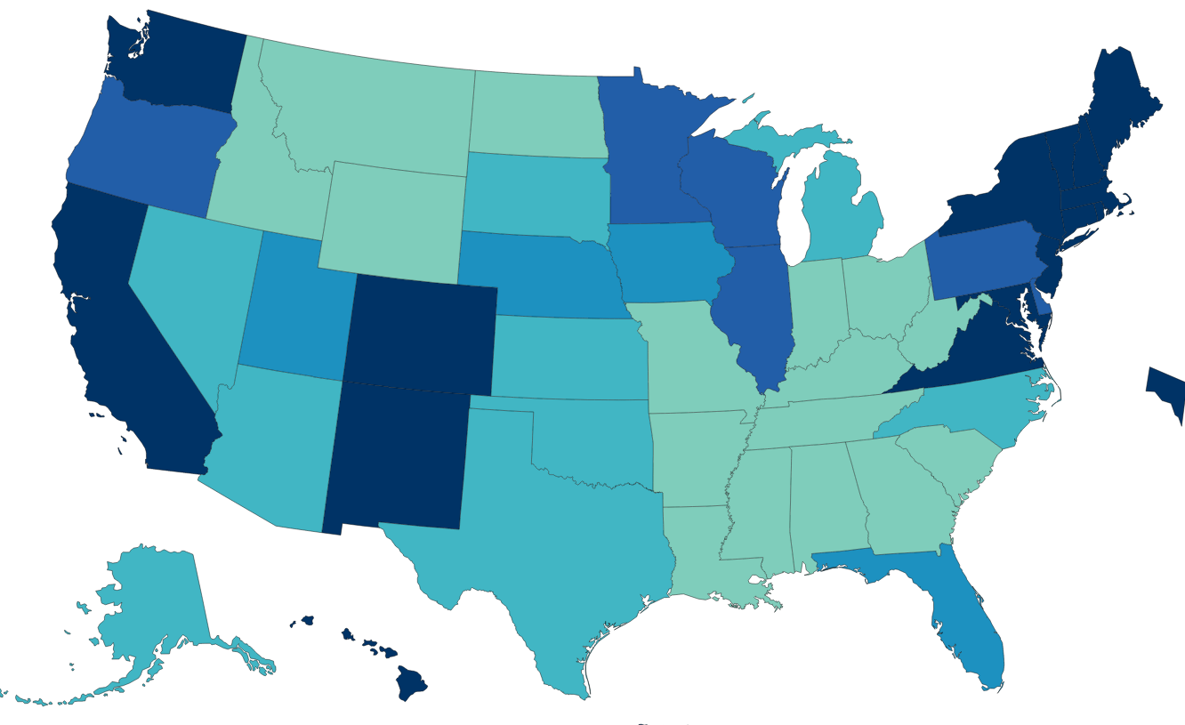 Democratic states average 80%, Republican states 66% and Mixed states 73%. The national average is 72%. Nevada (69%) is the only Blue state below 75%. Alabama, Wyoming and Mississippi have the lowest scores for the GOP at 59-60%. Florida has the highest rate at 75%. The split in world views is confirmed by this measure. The mixed group ranges from Louisiana and Georgia at 63% to Massachusetts (85%) and Vermont (86%).
