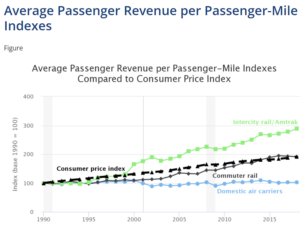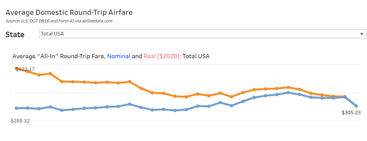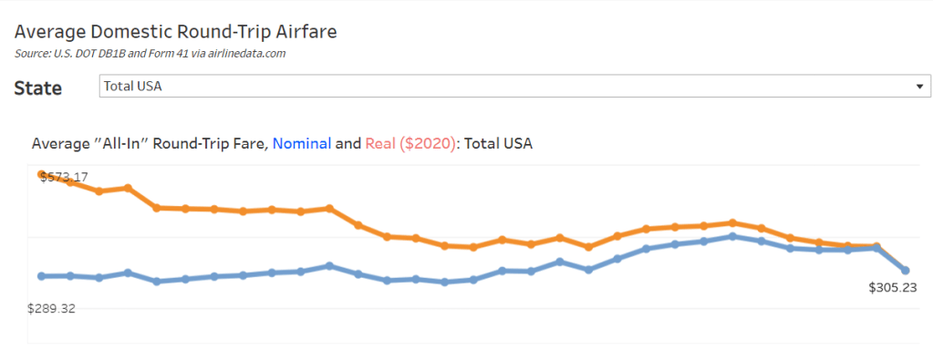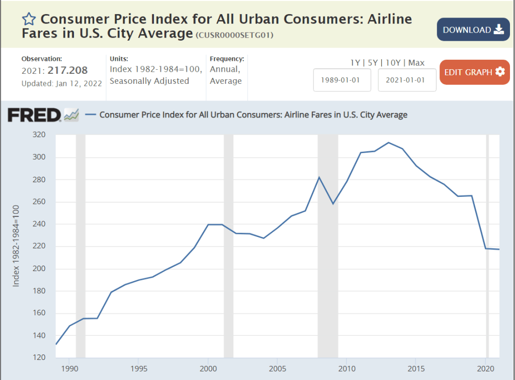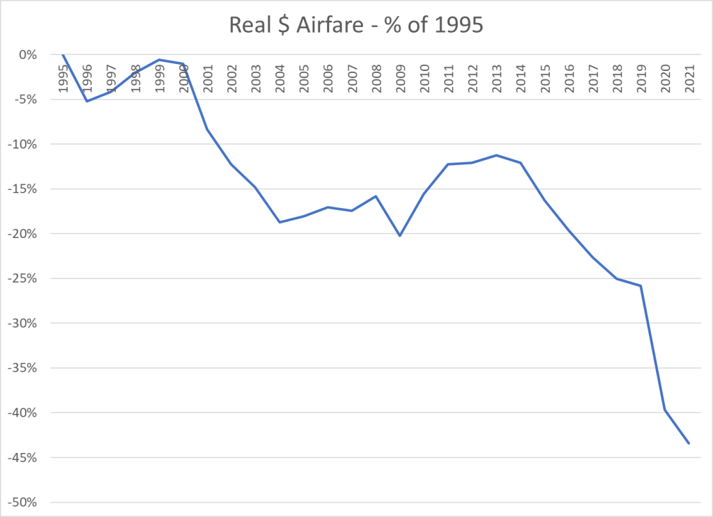 Fares then dropped year after year through 2019, reaching 26% below the 1995 baseline. They have fallen further in the pandemic years to 43% below the level of 25 years ago.