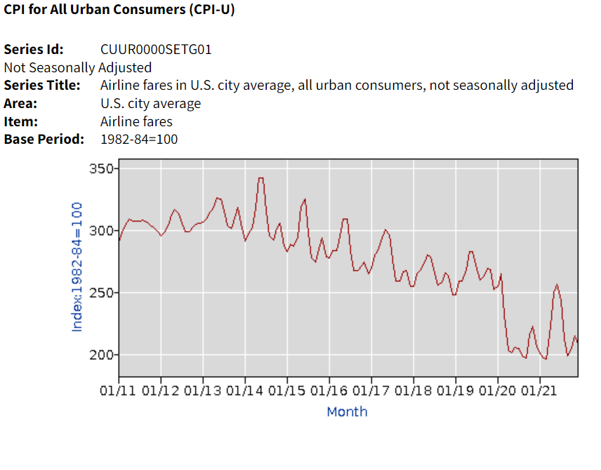 The Bureau of Labor Statistics compiles a consumer price index for air travel as part of the overall CPI. It compiles average prices and tries to adjust for changes in the quality of the product.