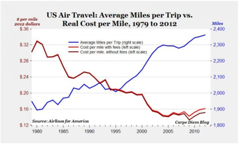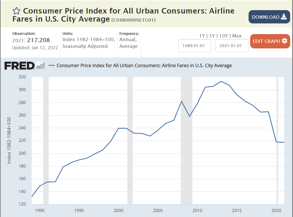 This article combines data from 4 sources with slightly different data. Airfares were flat at the end of the 20th century, but then dropped by 19% by 2004. They remained flat, in real terms, through 2009. Airlines pushed through 8% higher prices in 2010-11 and maintained real fares at the same level through 2014. After 19 years, real airfares were 14% lower than in 1995.