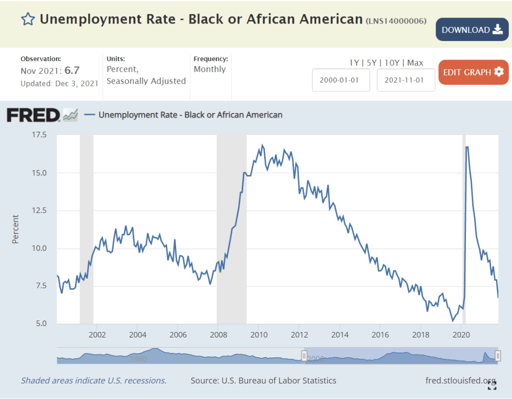 African-American unemployment was typically in the 8-10% range. It was driven down to the 5-6% level after the Great Recession during the extended business cycle expansion period. The rate is now below 7% and falling.