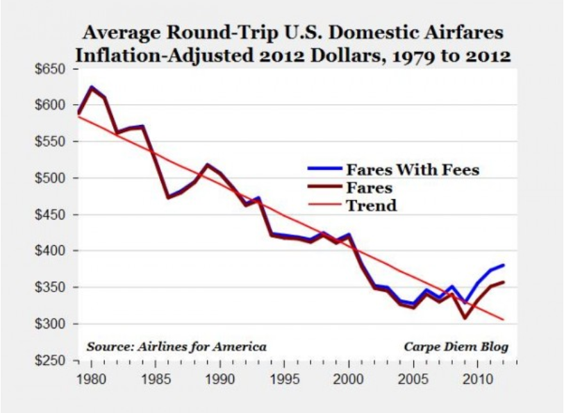 Real airfares declined consistently throughout the period, but no data source is fully compatible with the 4 summarized above. It appears that the real cost of flying declined by about one-third between 1979 and 1995 as the airline industry was deregulated.