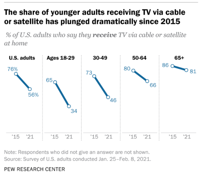 Cable TV subscribers and networks grew rapidly through the 1980’s and 1990’s reaching near universal availability. US subscribers plateaued from 2009-2014 at 100 million before rapidly declining to 74million in 2021. As the first graph shows, much of the decline has been a substitution of internet for cable access to media content. This is “good news” because everyone that wants it has access, but a new, better product has started to rapidly displace this 50 year-old technology.