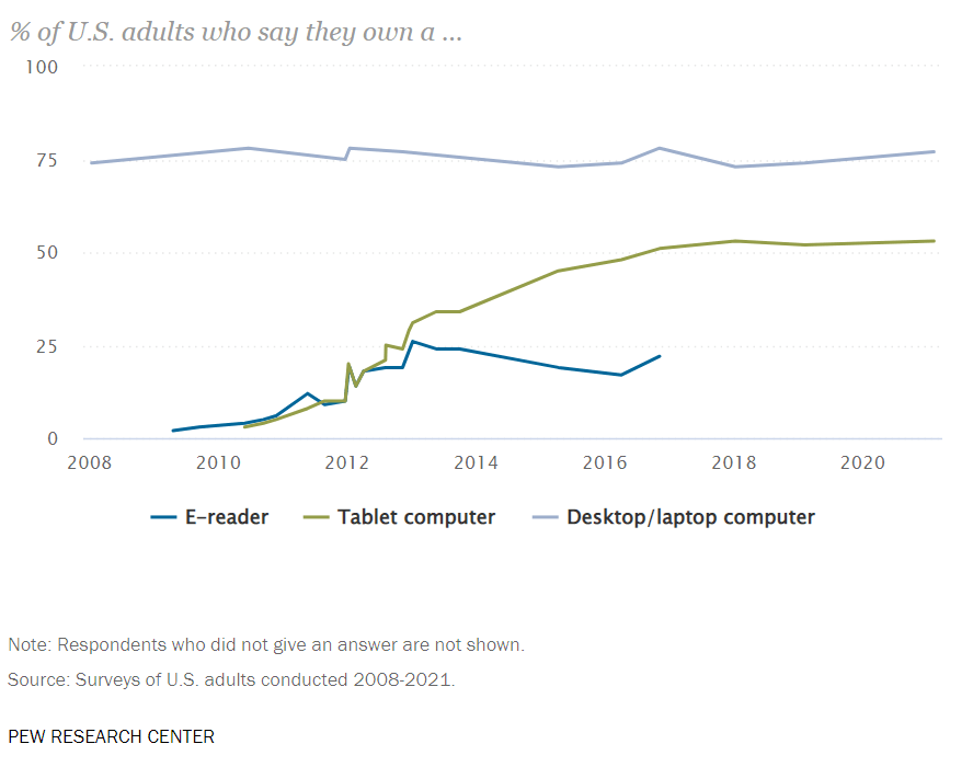Ownership of a home desktop or laptop computer also remains near universal, at 77% in 2021. The ownership of tablet computers has risen from 14% in 2012 to a majority of homes (53%) in 2021.
