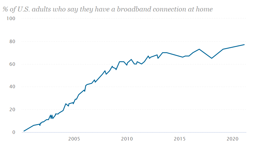Broadband internet access has rapidly grown from 1% of homes in 2000 to 58% in 2008 to 77% in 2021. The retired generation (65+) lags behind at 64% connectivity. Black (71%) and Hispanic (65%) homes are below the average. Rural residents are also less connected (72%).