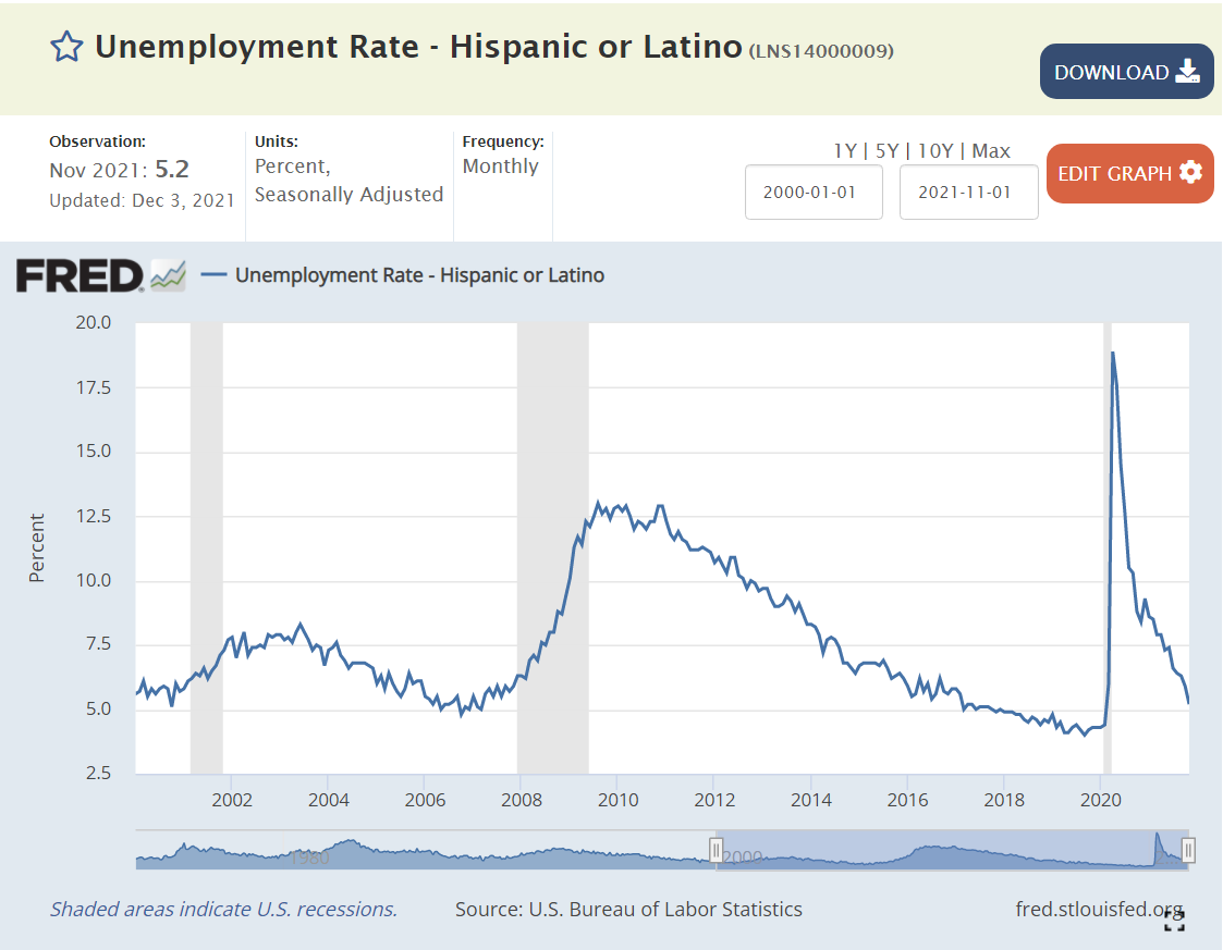 Hispanic American unemployment averaged 5-7% in the 2000’s. It spiked after the Great Recession to 13%, then slowly declined to 4.3%. It has since recovered to 5.2% and is dropping quickly.