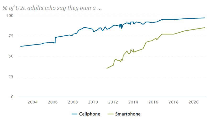 Smart phone ownership has grown rapidly from 35% in 2011 to 77% in 2016 to 85% in 2021. Ownership rates vary by age: 18-49 (95%), 50-64 (83%) and 65+ (61%). There is no racial ownership gap. Rural residents have an 80% ownership rate.