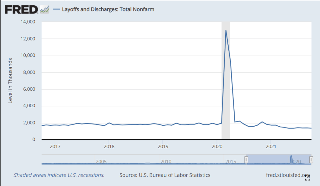 From 2000-2009, the dynamic US labor market laid off workers at a consistent 2M per year rate. This declined a bit to 1.8M per year in the next decade. After the pandemic, the economy quickly returned to this 1.8M per year rate from July to December, 2020.