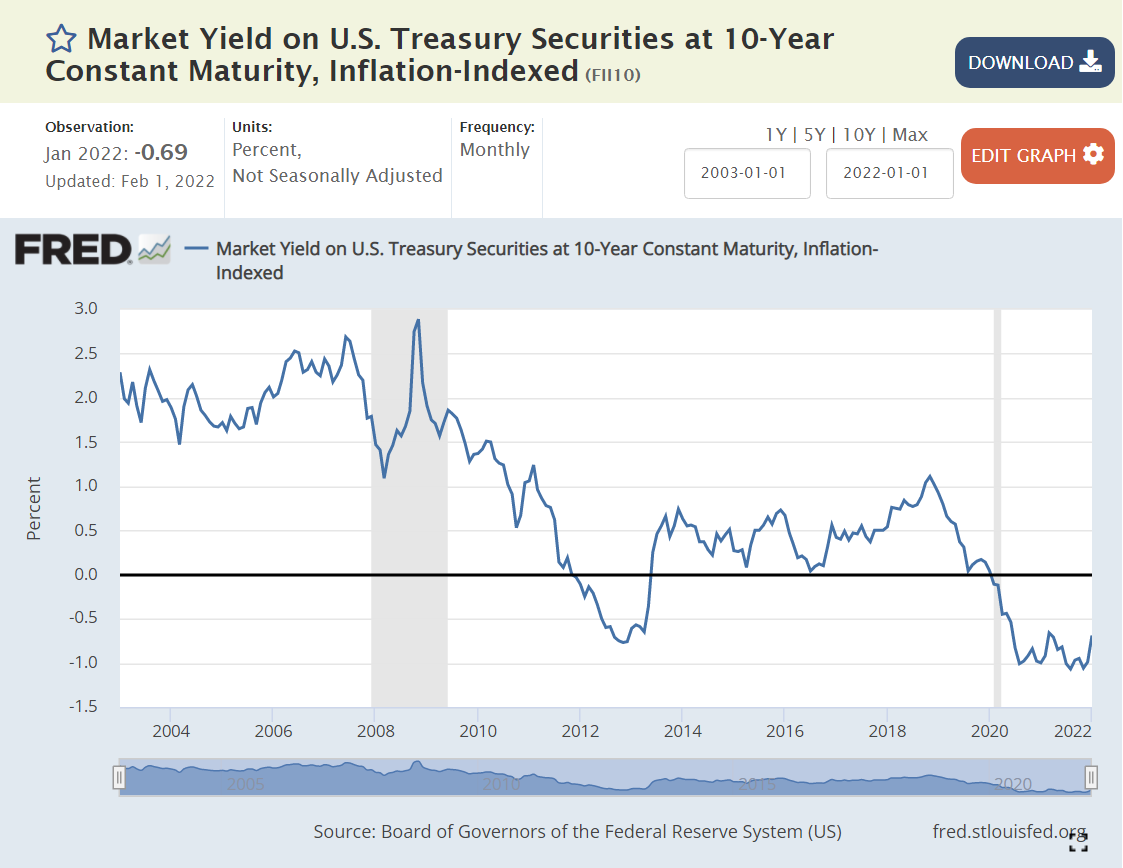 The “real” interest rate is the nominal interest rate minus the inflation rate. It reflects the “real” cost of borrowing. Prior to the “Great Recession”, 2% was a typical “real cost” of borrowing money. To entice lenders to lend, borrowers had to pay some “real” amount extra per year, 2%.