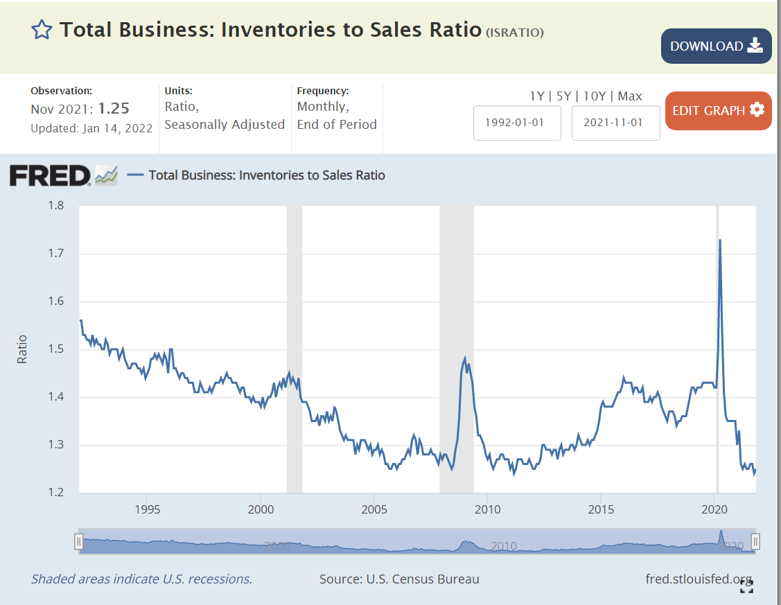 Easy money, easy fiscal policy and a 20% increase in demand for goods leads to major inflation. Like a frog getting boiled as a pot slowly warms up, we became complacent based on the apparently “just right” conditions of the late teens (2012-19). The federal budget deficit needs to get back above -5%, real interest rates need to become positive and consumers need to rebalance to consume more services and less goods. I don’t think we’ll see 7% inflation for 2022, but it looks like 4-5% is a good bet. Hold on.