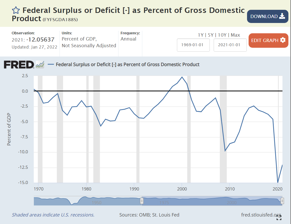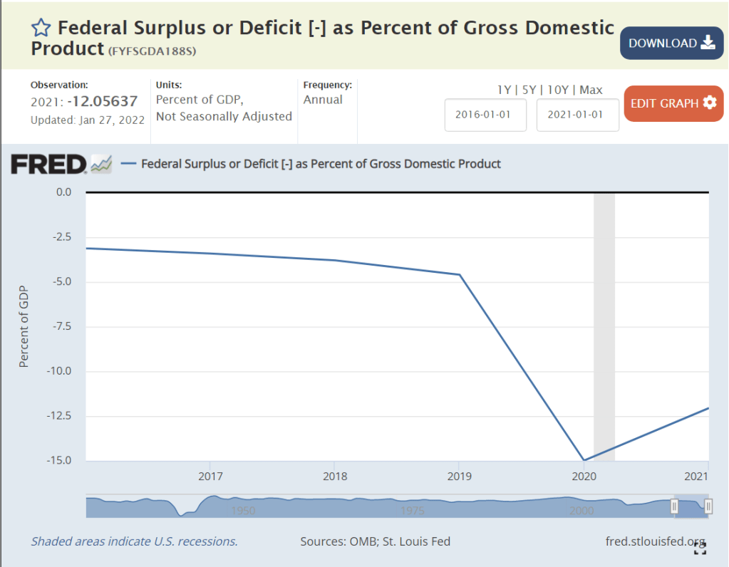 To address the pandemic, congress and Trump agreed to spend money to protect the economy and workers, leading to very large budget deficits of 15% and 12% in 2020 and 2021, respectively. Too much aggregate demand for the level of aggregate supply, so we have major inflation.
