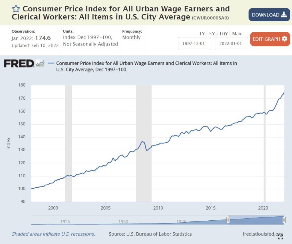 Inflation is back in the news after several quiet decades. The components of the All Urban Wage Earners and Clerical Workers are listed above, comparing Feb 2020 with a 1997 base of 100, and then Jan 2022 with the same base. The most recent weighting of categories is in the rightmost column.