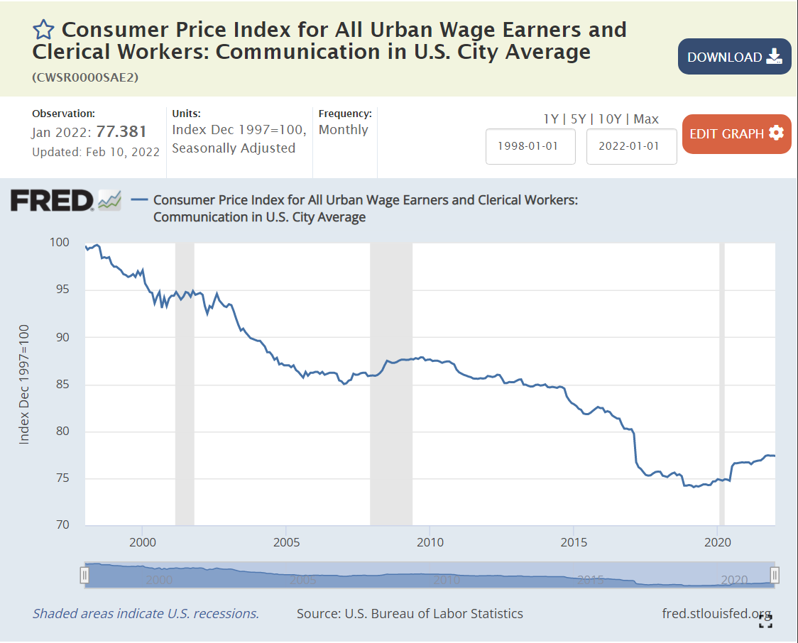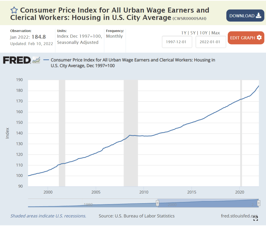 Overall, consumer prices have risen by a modest 2-2.5% annually, just 59% through Feb 2020 and 75% through Jan 2022. Yes, that is a 10% price increase in the last 2 years: 175/159.