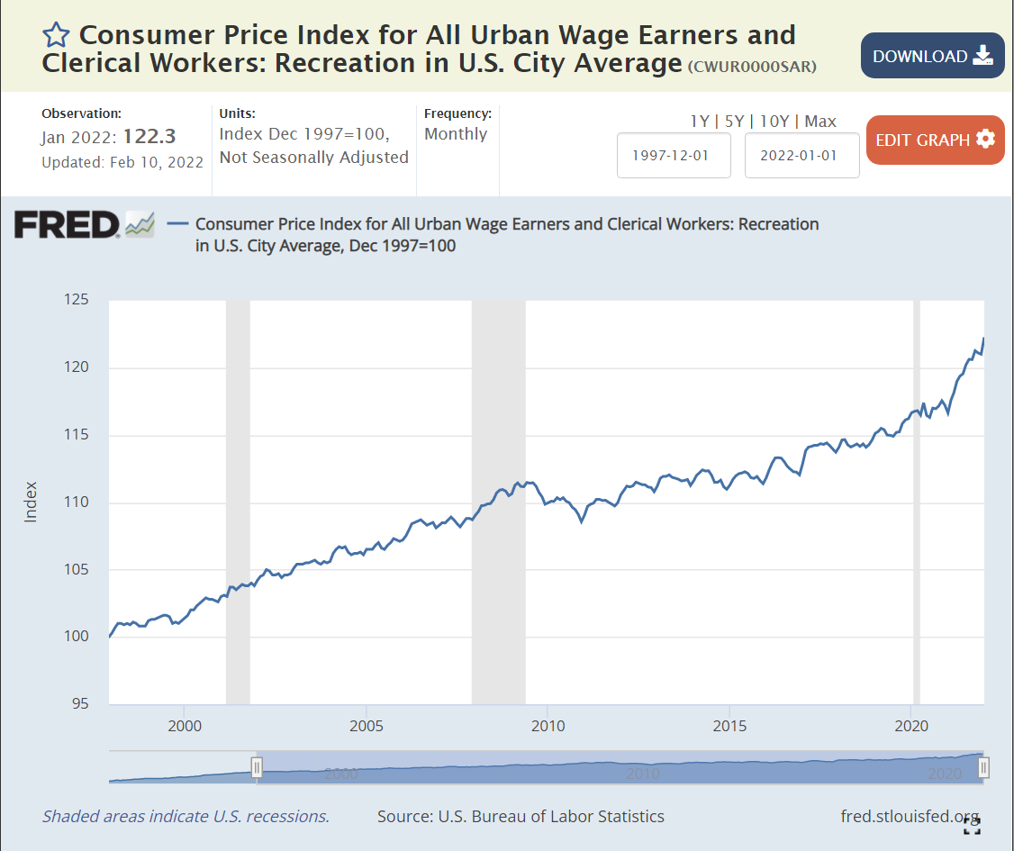 Some smaller areas have seen slow price growth. Apparel (3%) has declined in actual prices during this period. Recreation prices (4%) have grown by less than 1% annually.