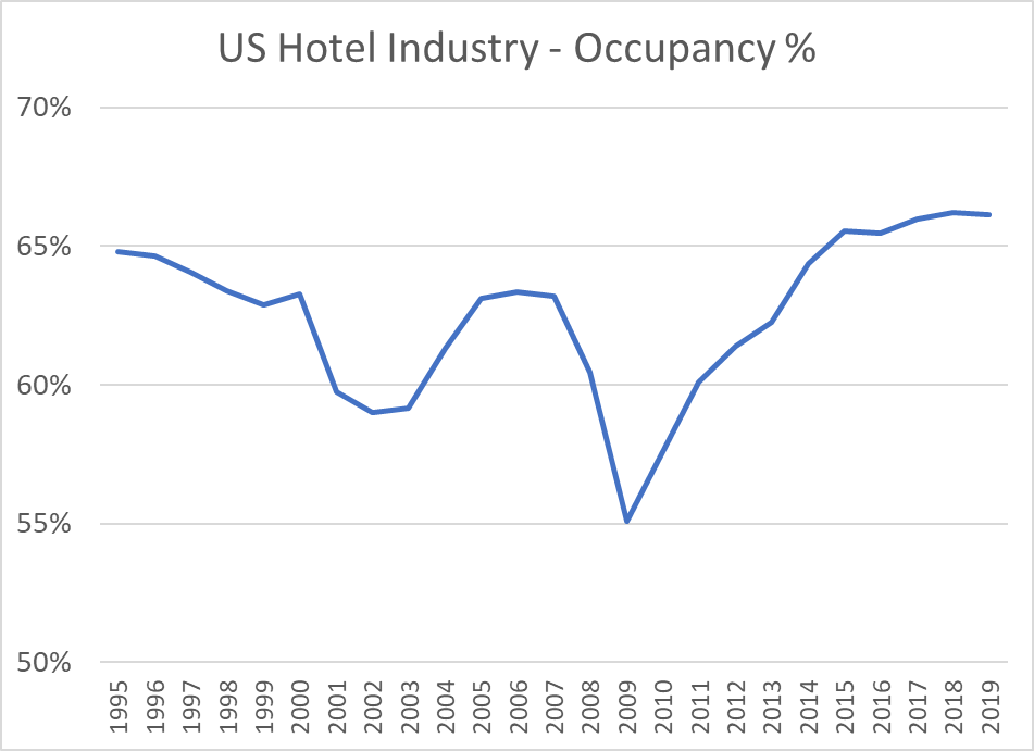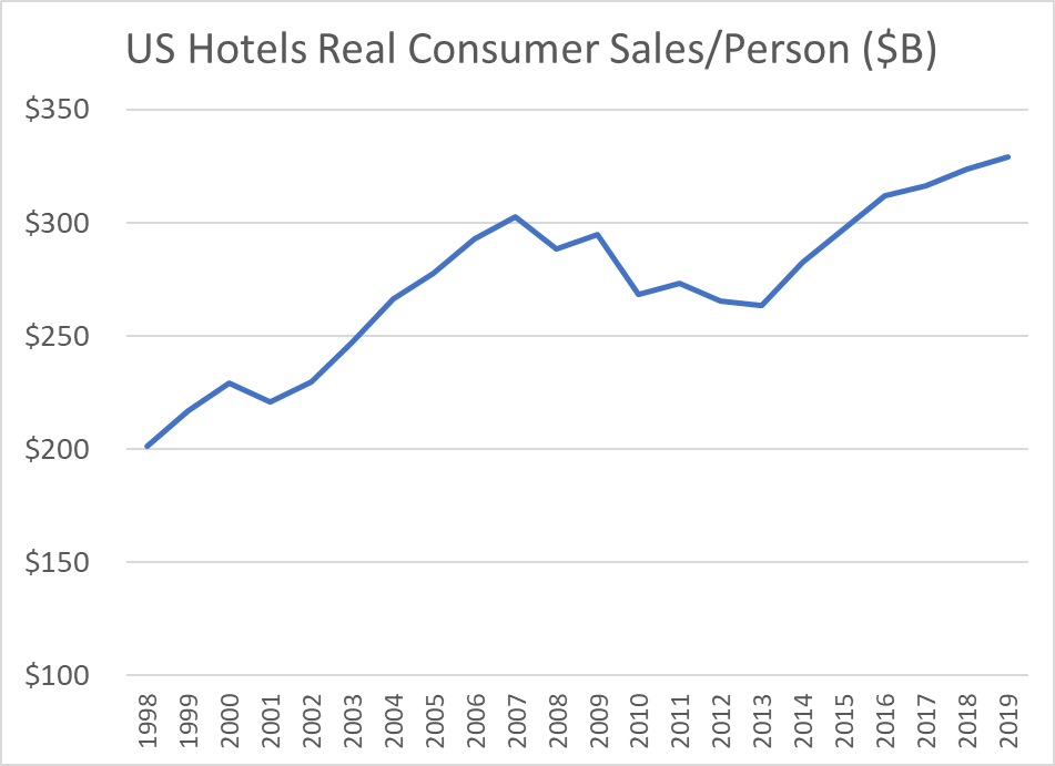 Total hotel industry real revenue ($2020) for the 21 years from 1998 through 2019 increased by a little less than 50% according to Bureau of Economic Analysis (BEA) figures.