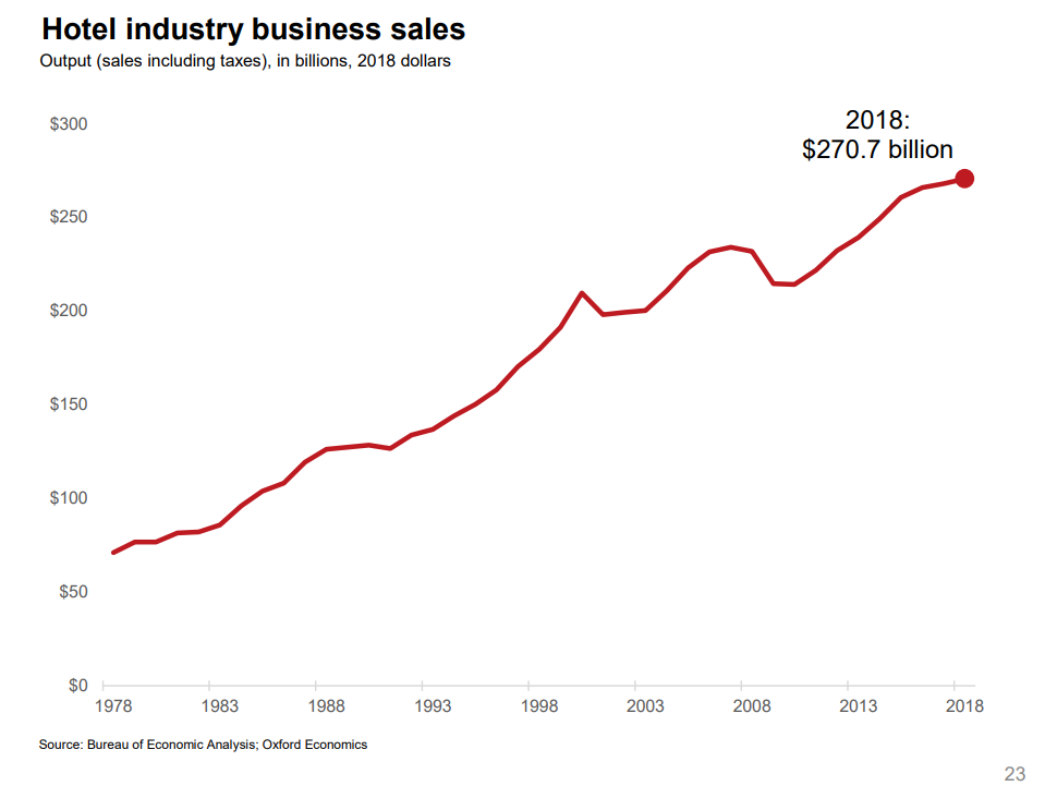 Oxford Economics developed an industry promotion brochure in 2019 that has some longer-term data. Total real (inflation adjusted) revenue is up more than 4 times in 40 years. Our 1995-2018 data shows relatively small changes in average hotel prices. I suspect that there were “real” increases from 1978 – 1995 as the industry was growing quickly in response to consumer demand.