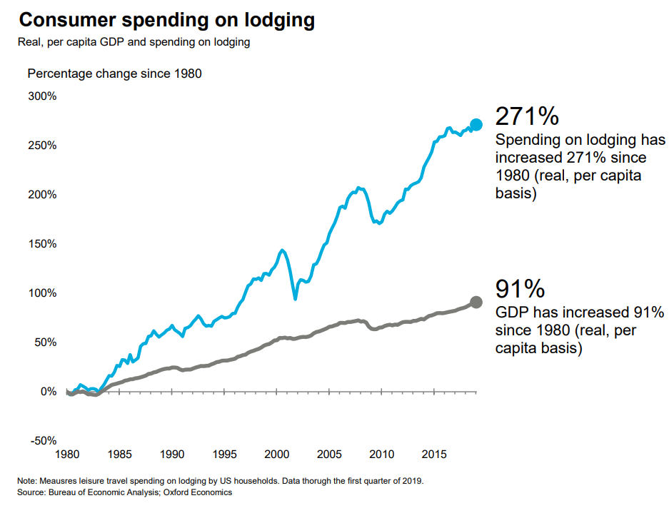 Consumer spending on accommodations has increased about 3 times as fast as GDP overall in the last 40 years.