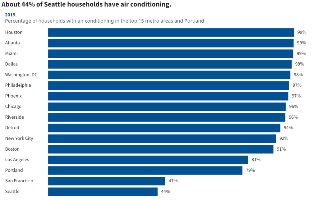 Air conditioning demand varies significantly by region/climate. AC use increased from 75-99% in the South, from 60-90% in the Midwest, from 50-85% in the northeast and from 40-60% in the West. AC demand varies based on peak temperatures, the number of days at peak temperature, the number of hours per day at peak temperature and the humidity (felt temperature). San Francisco, Portland and Seattle rarely “require” AC, even though their residents could afford this service.