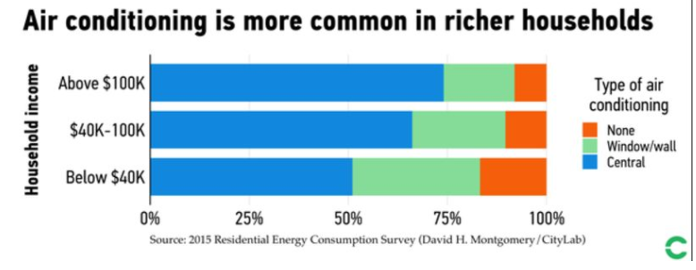 Air conditioning demand varies significantly by region/climate. AC use increased from 75-99% in the South, from 60-90% in the Midwest, from 50-85% in the northeast and from 40-60% in the West. AC demand varies based on peak temperatures, the number of days at peak temperature, the number of hours per day at peak temperature and the humidity (felt temperature). San Francisco, Portland and Seattle rarely “require” AC, even though their residents could afford this service.