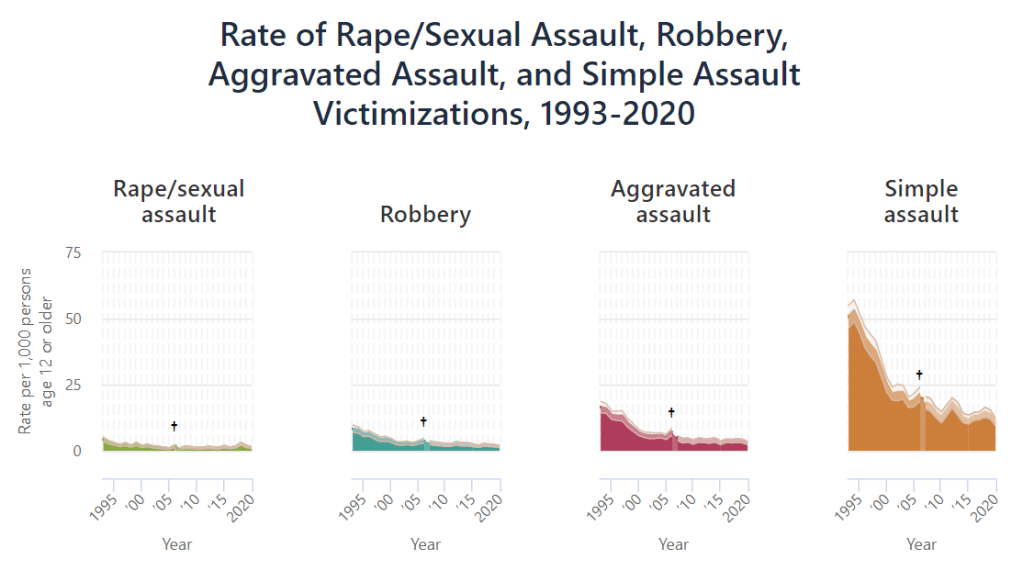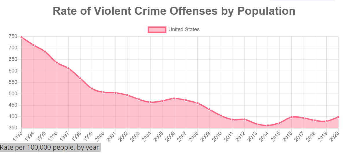 Despite the news media’s focus on urban homicide rates in 2019-20-21, the overall US violent crime rate continued to fall from 2000-2010 after an amazing drop from 1993-2000 and then stayed constant/flat for the next 10 years. This “flat” crime rate from 2010 to 2020 was AFTER a 40% drop in violent crime measured by the FBI stats and a 75% drop measured by the Bureau of Justice surveys of crime victims from 1993-2010.