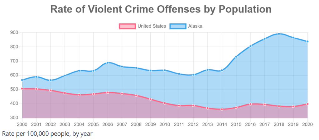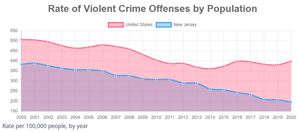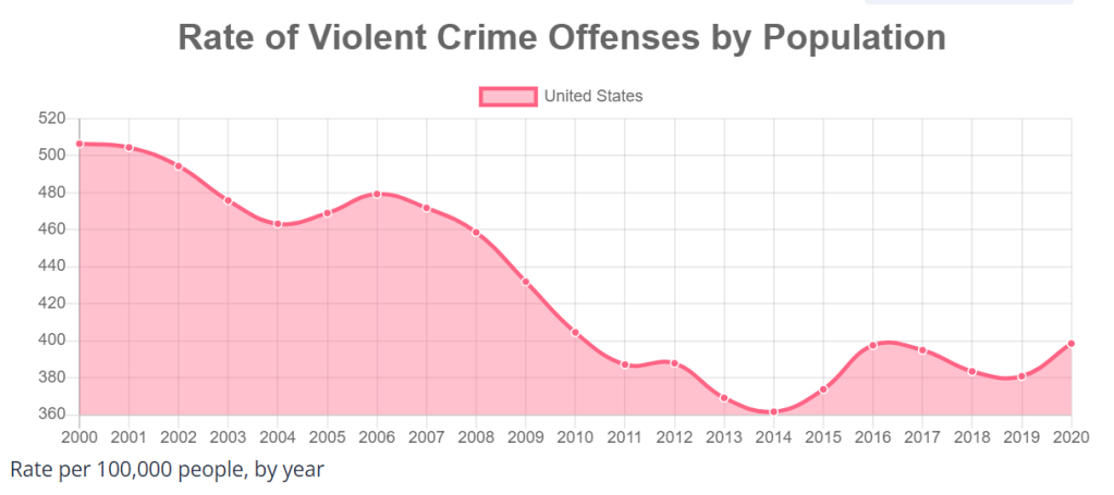 The total US violent crime rate dropped by an additional 22% from 2000 to 2010. It was flat between 2010 and 2020.