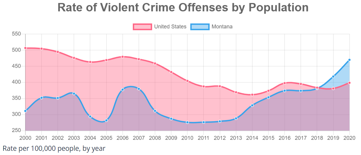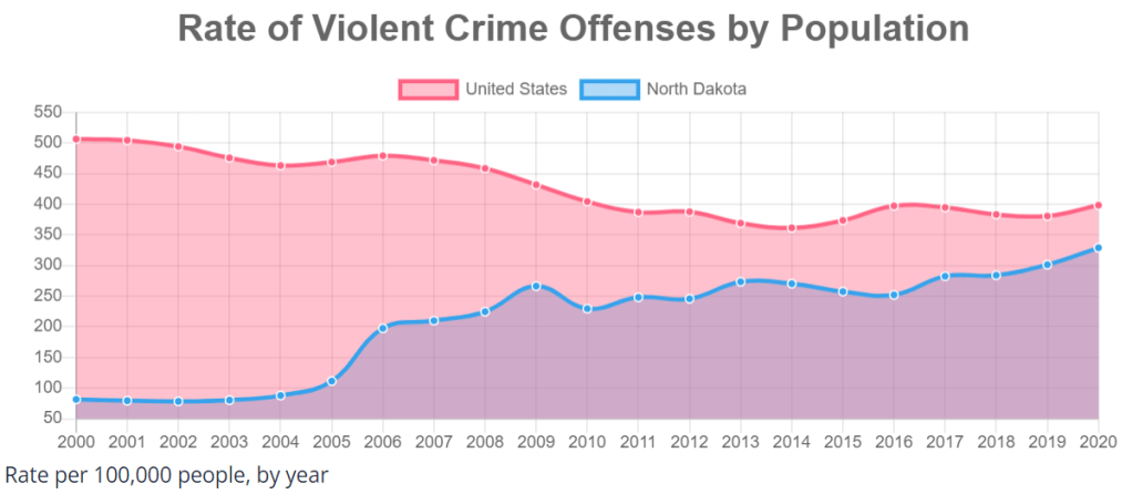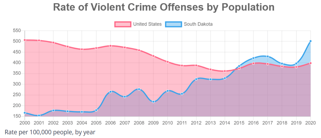 The 15 most rural states had crime rates of 321, 309 and 400 versus the national averages of 510, 400 and 400. The 15 rural states in 2000 had violent crime rates more than one-third lower than the national average. By 2020, they had increased to match the national average.