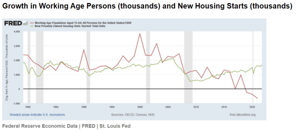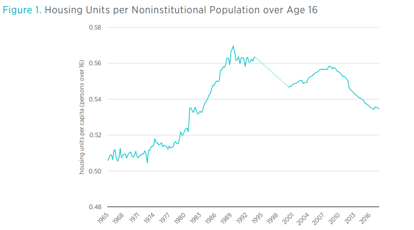 Housing units per capita has declined. New housing starts have not kept up with population growth.