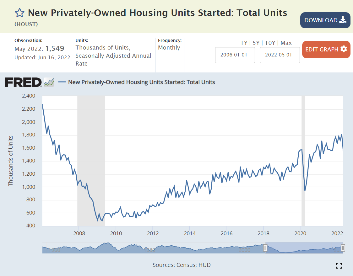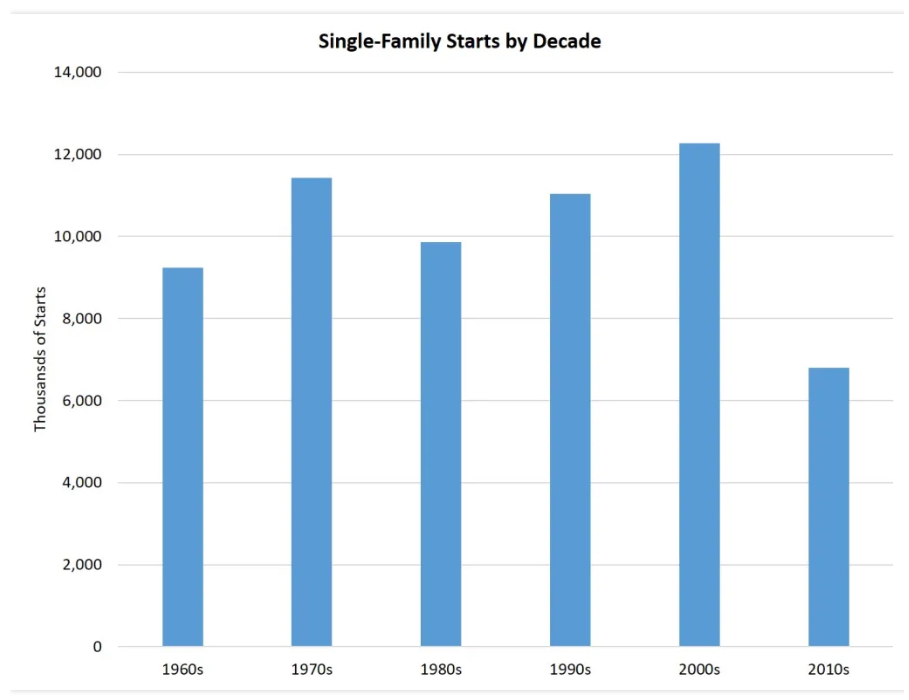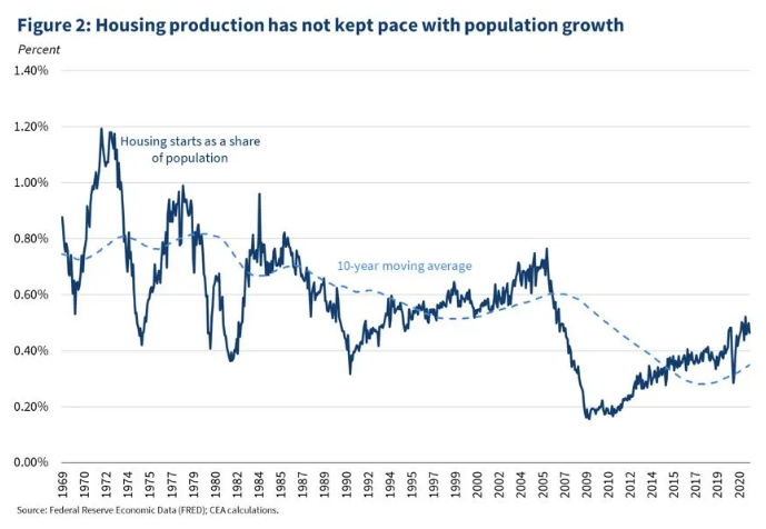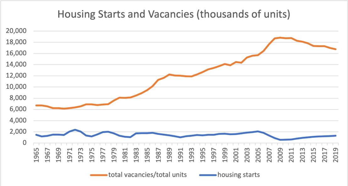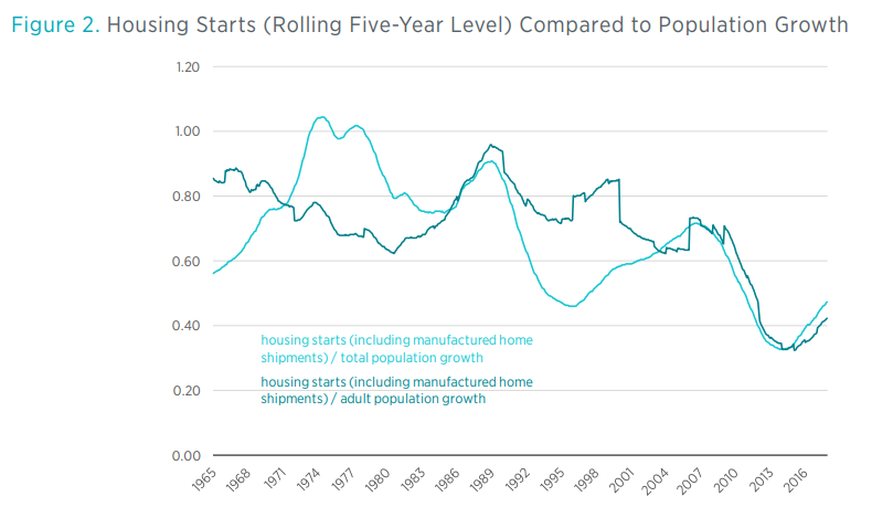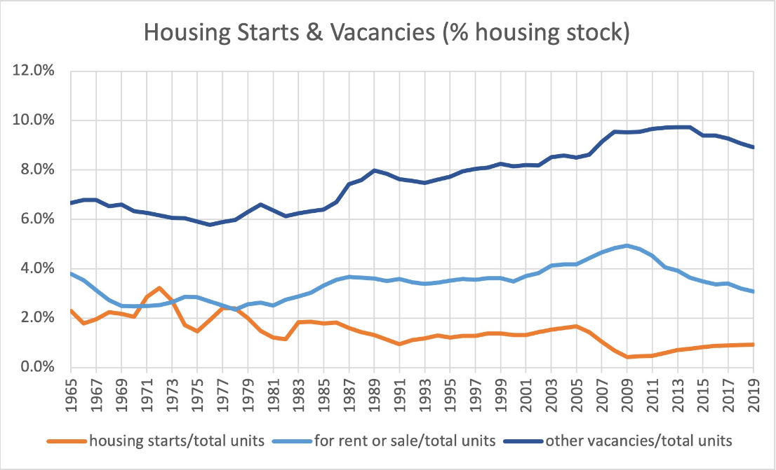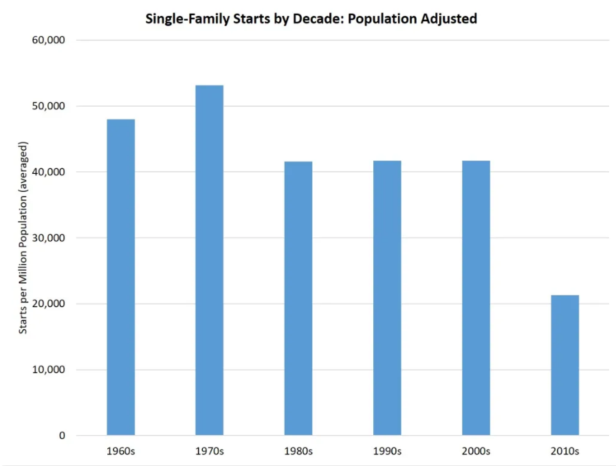 Housing units per capita has declined. New housing starts have not kept up with population growth.