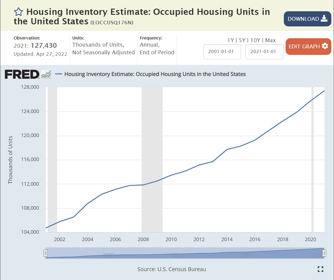 The number of owner-occupied (single-family) homes reached a peak of 76 million in 2006 and then flat-lined for eleven (11) years through 2017. An estimated 8 million homes have been added in the last 5 years, about 1.8M per year after zero per year for 11 years.