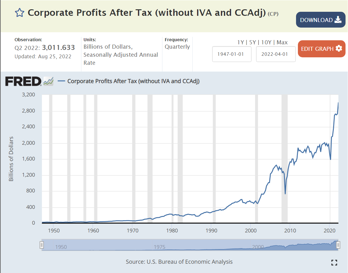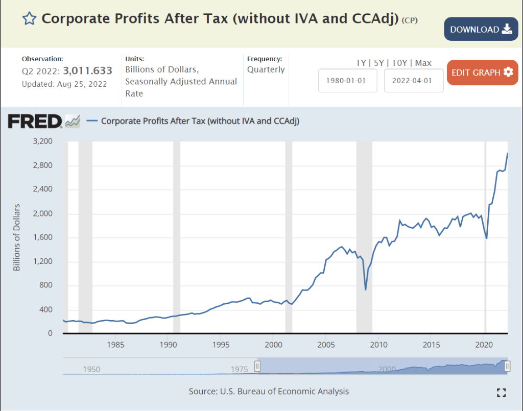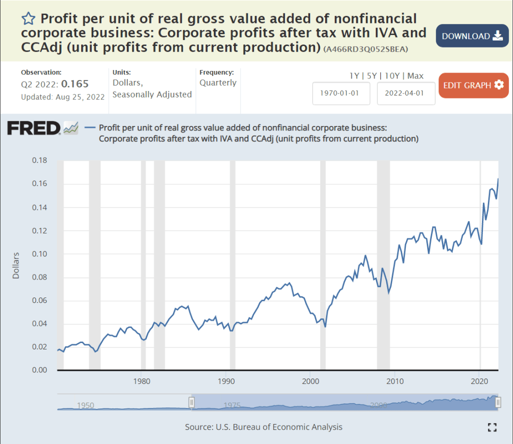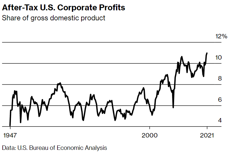 By a dozen measures, profit has consistently grown as a share of the American economy in the last 40-50 years. This necessarily means that the share of output and income received by labor is much smaller as a percentage of the total pie. The recent surprising ability of American corporations to effectively work through the pandemic supply chain disruptions, lose more than 10% of their labor force, increase nominal wages significantly, encounter severe input price inflation and still engineer price increases to come out much further ahead on profits is a major story for our time.