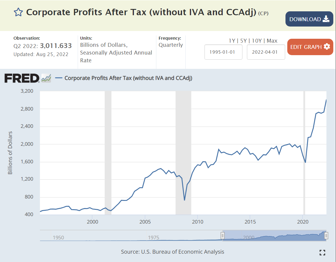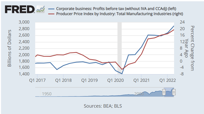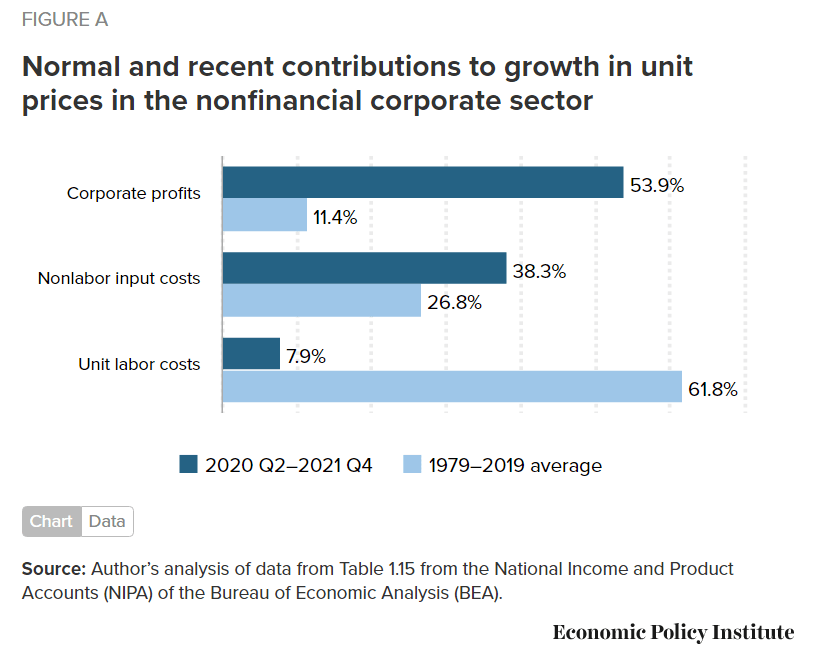 A variety of sources provide compelling data and logic to indicate that corporations are “taking advantage of” the post-pandemic inflation caused by supply chain issues and expansive fiscal and monetary policies to boost prices at rates faster than their costs of inputs (suppliers, labor, capital).