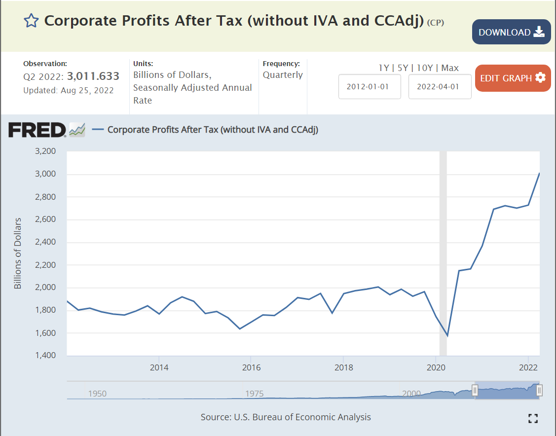 The media has published many articles, especially noting the increase of profits, overall, since before the pandemic. This is a popular topic because the result is certainly counterintuitive and because President Biden and the more left-leaning national Democrats have been criticizing corporations for “price gauging” and causing the recent inflation spike.