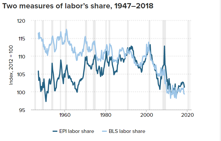 Another way to consider profits is to view its complement, the share of national income received by labor.