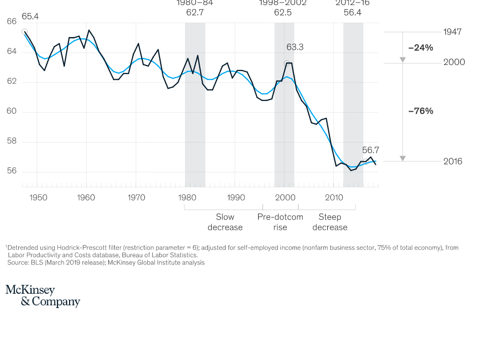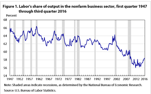 Labor share of total income has dropped by 15% in the long-run by this measure.